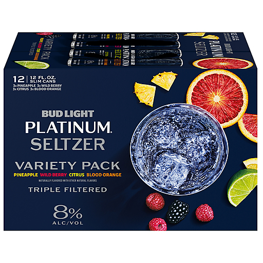 Bud Light Platinum Seltzer is a premium and delicious hard seltzer drink with fruit flavors. This variety pack includes wild berry, citrus, blood orange, and pineapple flavored hard seltzers. These hard seltzer drinks are made with sparkling water and natural fruit flavors. These alcoholic drinks have balanced sweetness and fruit flavor with a subtle alcohol bite. Each serving of Bud Light Platinum Seltzer has 170 calories and less than 3 grams of sugar. These gluten free alcohol drinks have an 8% ABV and are made with natural flavors. The slim canned seltzer is easy to hold, store and transport. Enjoy these refreshing alcoholic fruit drinks at gatherings or enjoy a hard flavored seltzer during any occasion. Bud Light Platinum Seltzer Variety Pack, Hard Seltzer, 12 Pack 12 fl oz 8% ABV