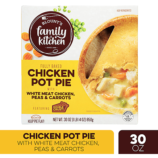 Enjoy the home-cooked taste of a delicious packaged meal with Blount's Family Kitchen Chicken Pot Pie. This oven ready meal brings together a bounty of carefully sourced ingredients in a delicious recipe. This pot pie, with white meat chicken and a buttery crust, is sure to taste like home. The Blount family uses the highest quality ingredients, including fresh chicken raised without antibiotics, to create easy microwave meals. Bake this meal in a conventional oven for 30-35 minutes to 165 degrees F. Savor the flavor so you can savor the time.