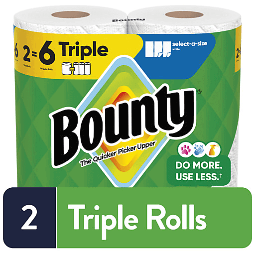Bounty Paper Towels are 2x more absorbent, so you can clean up messes quicker and use less than the leading ordinary brand. Each sheet has a Durable Diamond Texture to tackle anything from everyday spills to tough projects throughout your home. A variety of pack and rolls sizes are available, and going bigger means you change the roll less often* to always have Bounty on hand. Buy in bulk! Choose from different sheet sizes based on what works best for your needs, including Select-A-Size and Full-Size. You can also change it up with our printed designs.