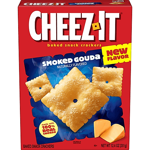 Outrageously cheesy and ridiculously craveable, Cheez-It baked snack crackers are deliciously crunchy little crackers that have captured cheese-lovers for decades. Discover a Smoked Gouda snack made with 100% real cheese baked to crispy perfection for an irresistible taste in every crunchy bite. Each lightly salted cracker is loaded with smoky and smooth gouda flavor, a burst of cheesy flavor; Cheez-It baked snack crackers are a fan-favorite for game night, school snacks, family movie nights, party spreads, late-night snacking, and so much more, the cheesy options are endless. Delicious for all ages, grab a box of Cheez-It Smoked Gouda crackers for every family snacking moment. Whether you're packing them in school lunches, grabbing some for the office, or taking along on a road trip, you'll find a delicious, crisp snack that is filled with big cheese flavor. It’s no wonder these bite-sized crackers have become a crowd-favorite, bringing smiles and that urge for just one more handful.