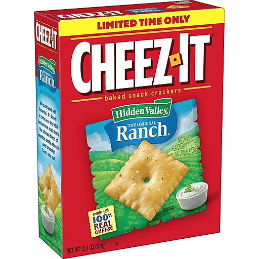 Ranch lovers, unite! America's #1 Ranch* brings its signature taste to Cheez-It crackers. Cheez-It Hidden Valley Ranch crackers are the perfect bite-sized snack bursting with the iconic flavor of America's favorite dressing. Discover a new, crowd-favorite snack made with 100% real cheese baked to crispy perfection for an irresistible ranch taste in every crunchy bite; Cheez-It baked snack crackers are a fan-favorite for game night, school snacks, family movie nights, party spreads, late-night snacking, and so much more, the cheesy options are endless. Delicious for all ages, grab a box of Cheez-It Hidden Valley Ranch crackers for every family snacking moment. Whether you're packing them in school lunches, grabbing some for the office, or taking along on a road trip, you'll find a delicious, crisp snack that is filled with big ranch flavor. It’s no wonder that these bite-sized crackers have become a crowd-favorite, bringing smiles and that urge for just one more handful. *Based on IRI unit sales data for L52WE 8/20/23
