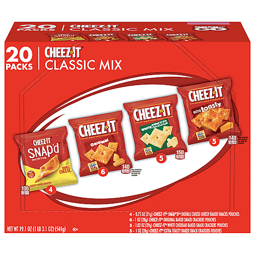 Outrageously cheesy and perfectly portable, these pouches of Cheez-It baked snack crackers and cheese cracker chips contain deliciously crunchy crackers that have captured cheese-lovers for decades. This variety pack includes Original, White Cheddar, and Extra Toasty plus Cheez-It Snap'd Double Cheese flavors, enough flavors to satisfy any snack craving. Each crisp is loaded with bold cheesy flavor. These Cheez-It crackers are conveniently packaged for on-the-go snacking; Cheez-It cheese crackers are an on-the-go fan-favorite for game night, school snacks, lunches, family movie nights, late-night snacking, and so much more, the cheesy options are endless. Delicious for all ages, grab a pouch of Cheez-It crackers for every family snacking moment. Whether you're grabbing some for the office or on a road trip, you'll find a snack that's filled with big cheese flavor. It’s no wonder that these crackers have become a crowd-favorite, bringing smiles and that urge for just one more handful.