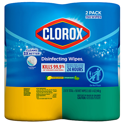 Clean feels good when you clean with Clorox Disinfecting Cleaning Wipes, now with new sparkling scents. These wipes deliver an effective clean and sparkling scent with every wipe. Safe to use on over 100 surfaces, including finished wood, sealed granite, glass and stainless steel, the Clorox Disinfecting Wipes you know and trust are ideal for the kitchen, bathroom and high touch areas. This variety pack includes 1 Crisp Lemon and 1 Fresh Scent canisters of bleach free wipes that fight odor causing bacteria for 48 hours on non food contact surfaces when used as directed. Tackle messes effortlessly with Clorox wipes that clean 3X better than a wet paper towel, allowing you to clean more with one wipe (1). Clorox Disinfecting Wipes kill 99.9% of germs, including Pseudomonas aeruginosa, Salmonella enterica and Staphylococcus aureus, when used as directed on hard, nonporous surfaces.