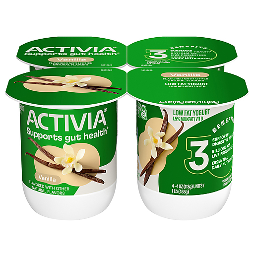 Start your day with your gut health in mind with Activia Probiotic Vanilla Low Fat Yogurt Cups, from the #1 doctor-recommended probiotic brand.*** Every spoonful is loaded with delicious flavor and creamy texture. Backed by 20 years of gut health research and innovation, this refreshingly smooth vanilla flavored yogurt contains billions of probiotics, 5 live cultures and essential nutrients.** Probiotics are the living microorganisms that have been studied and shown to provide specific health benefits, including supporting gut health.* Making Activia probiotic yogurt a part of your daily routine is an easy way to help support your gut health.* Grab an Activia yogurt for part of an easy and delicious breakfast, mix it into a yogurt smoothie, or enjoy one in the afternoon as an on the go snack. Your gut is where it all begins. Start with Activia. *Enjoying Activia twice a day for two weeks as part of a balanced diet and healthy lifestyle may help reduce the frequency of minor digestive discomfort, which includes gas, bloating, rumbling, and abdominal discomfort. **Contains at least 10% DV of calcium & vitamin D per serving. ***Based on a 2024 national weighted survey of doctors (Primary Care, OBGYN, Gastroenterologist).