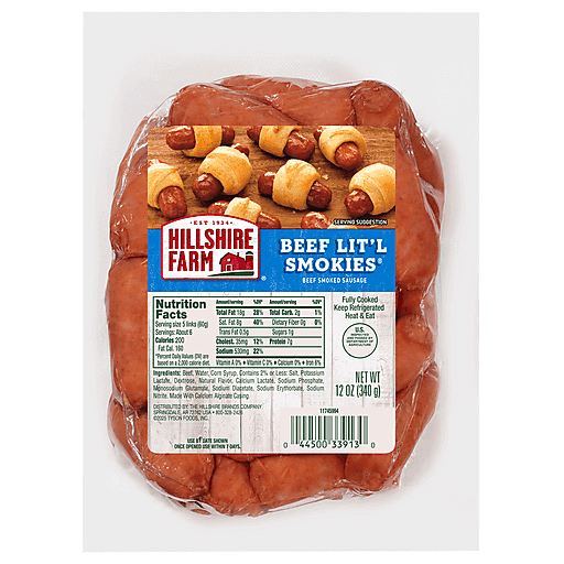 Hillshire Farm Lit’l Smokies Smoked Sausages are the perfect snack. Made with farmhouse quality cuts of beef and smoked to perfection, this cocktail sausage is fully cooked and bursting with beef smoked sausage flavor. Heat these cocktail weenies on the stove, in the microwave or in the oven for a fun snack. Use these beef sausages to create appetizers, such as pigs in a blanket.