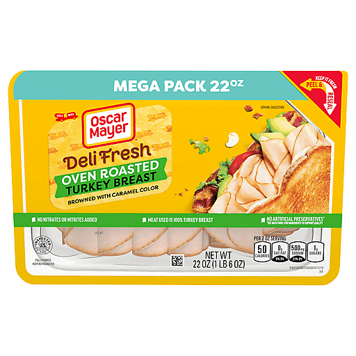 Make a delicious deli sandwich at home with Oscar Mayer Deli Fresh Oven Roasted Turkey Breast Sliced Lunch Meat. Our quality turkey deli meat is made with no artificial preservatives* and no added nitrates or nitrites. *See ingredient line for ingredients to support quality. Fully cooked and ready to eat, our turkey slices have a rich, classic turkey flavor that's perfect for a sandwich, salad, or cheese and crackers. Keep our mega pack 22-ounce package of deli turkey refrigerated to maintain freshness. If you enjoy our oven roasted deli turkey, be sure to try the other varieties of Oscar Mayer turkey lunch meat.