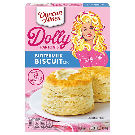 Whip up deliciously flaky biscuits with Dolly Parton's Buttermilk Biscuit Mix from Duncan Hines. This easy-to-make biscuit mix makes about 14 biscuits and is perfect for serving fluffy breakfast biscuits or creating an irresistible side dish for any meal. You can create Dolly's favorite recipe, which is featured on the box, or you can let creativity guide you and add your own spin on these buttermilk biscuits.