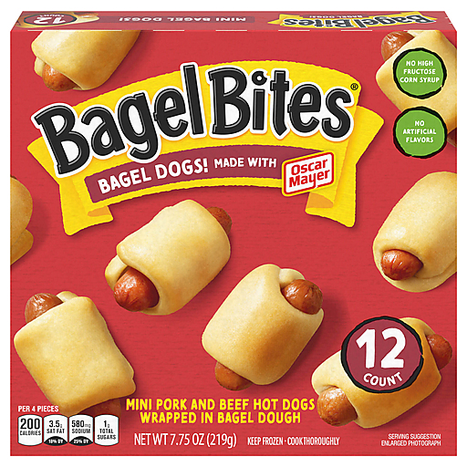 Bagel Bites Bagel Dogs offer a quick and easy snack that everybody loves. Delicious mini Oscar Mayer hot dogs are wrapped in bagel dough for a classic crispy taste that excites your taste buds. Snacktime is always a hit when you serve our wrapped hot dogs at a party or as an after-school snack. Made with mini pork and beef hot dogs, our snacks have 7 grams of protein and 0 grams of trans fat per serving. Our bagel dogs contain no artificial flavors or high-fructose corn syrup. Bake our bite-sized snacks in the oven or toaster oven, or microwave them for a quick treat. Each 12 count box of Bagel Bites Bagel Dogs includes a convenient microwavable tray for easy prep. Keep the 7.75 ounce box frozen until ready to enjoy.