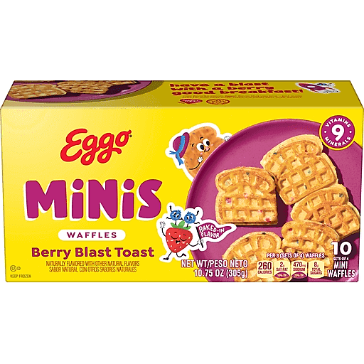Wake up and greet the day with the feel-good taste of Eggo Minis Berry Blast Toast waffle bites. Crafted with delicious ingredients and sweet berry flavor, Eggo Minis waffle bites are a perfect balance of crispy, fluffy goodness. They're convenient, easy to prepare, and help bring smiles to fast-paced, busy mornings. Great for families and individuals, these scrumptious waffles are made to enjoy as a part of a balanced breakfast; They pair well with your favorite morning toppings like butter, syrup, jellies, fruit, chocolate or hazelnut spreads, and whipped cream. With colors and flavors from natural sources, our waffles also provide a good source of 9 vitamins and minerals. Not just for morning, Eggo Minis waffle bites make warm, comforting after-school snacking occasions, late-night treats, and are great for making ice-cream sandwiches. They're just so delicious, would you L'Eggo your Eggo?