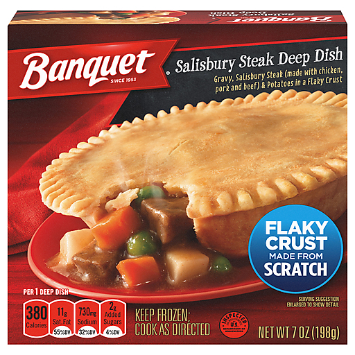 Banquet Salisbury Steak Deep Dish Pot Pie gives you quick, ready made meals in minutes. This easy dinner features creamy gravy with chunks of tender Salisbury steak, potatoes and vegetables surrounded in a flaky crust made from scratch for a hearty meal. Preparation of this frozen food is easy. Simply follow the instructions on the package to prepare frozen dinner in the oven for fresh-baked taste or in the microwave for a quick dinner. Keep this frozen meal in the freezer until you're ready to prepare it. in the U.S.A. for over 60 years, Banquet has been making delicious food the whole family loves.