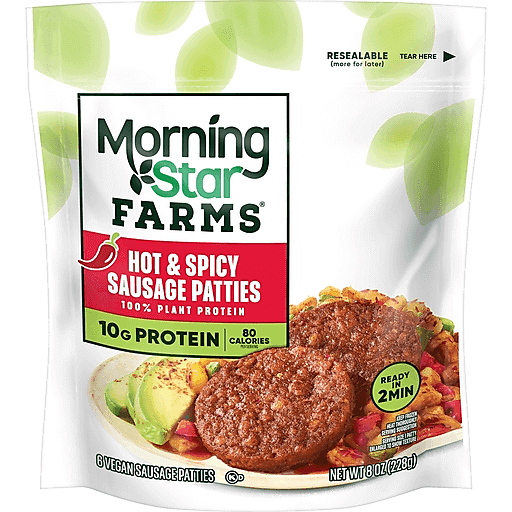 MorningStar Farms Hot and Spicy vegan sausage patties are plant-based and seasoned with an inviting blend of aromatic spices to delight everyone in your family. With 77% less fat than cooked pork sausage*, MorningStar Farms Hot and Spicy vegan sausage patties provide a good source of protein (10% of daily value); Whether you’re whipping up a breakfast scramble, a short stack of pancakes, or biscuits with veggie gravy, MorningStar Farms Hot and Spicy sausage patties are sure to please vegans and meat-lovers alike. These vegan sausage patties make a wonderful addition to breakfast sandwiches, too. MorningStar Farms makes it so easy to get your plant-based protein any time of the day. *Cooked pork sausage contains 16g total fat per serving (38g). MorningStar Farms Veggie Hot and Spicy Sausage Patties contain 3.5g total fat per serving (38g).