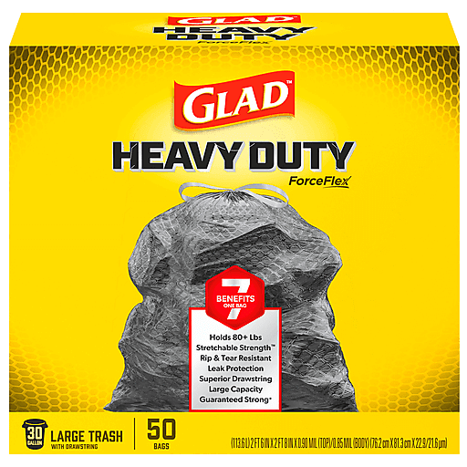 Conquer the toughest cleanup jobs with Glad ForceFlex Large Trash Drawstring Bags. Engineered with patented ForceFlex technology, these heavy duty trash bags stretch and flex to prevent rips and tears. These large garbage bags are designed to fit most tall garbage cans and 30 gallon trash cans, making them perfect for garage cleanouts, yard projects, renovations or daily household use. Featuring seven benefits in one bag, these 30 gallon trash bags hold 80+ pounds and have stretchable strength, leak protection, superior drawstrings and large capacity. These tall garbage bags are unscented, so you won’t have to worry about any added fragrance. Each box includes 50 tall trash bags, ensuring you’ll always have a garbage bag on hand when you need it most. Whether you’re looking for ForceFlex trash bags for outdoor garbage cans or tall trash bags for kitchen cleanup, Glad delivers the heavy duty performance you demand for any mess, big or small.