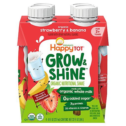 Introducing Happy Tot Organic Grow & Shine, a delightful nutritional shake crafted to help support your little one's growth and development. This delicious drink is made with organic Grade A whole milk from pasture-raised cows* and contains 0g added sugar**. Grow & Shine delivers 20 vitamins and minerals like Vitamins C, D, B6, and Iron to help support the immune system, and 50mg of DHA to help support brain health. Plus, with calcium and vitamin D – Grow & Shine helps support bone health. With 7 grams of protein per serving to help support muscle development, it’s a great supplement for picky eaters, whether served with a meal or as a snack. Grow & Shine shakes are USDA organic, non-GMO and made with no corn syrup, no added seed oils*** and no artificial sweeteners, flavors or colors.