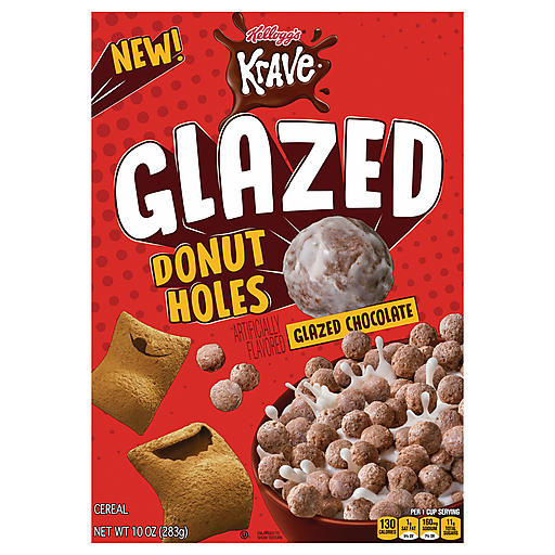 Chocolate donut lovers, we’re giving Kellogg's Krave Glazed Donut Holes cereal a glaze up. These sweet, crispy, donut-hole shapes will blow up your breakfast game with their chocolatey crunch and sweet glaze, made especially for fans of Kellogg's Krave. This cereal is a crossover of fun with the chocolatey Krave flavor you know and love in a crispy round shape with a shiny glaze that adds a sweet flavor to every bite; Pour these crunchy little pieces into a bowl and slurp up the delicious donut-flavored milk. Max glaze equals max flavor, so that's why we added the melt-in-your-mouth glaze on every single donut-inspired bite. We did the math, and donut holes are the perfect shape to deliver more deliciousness. Wake up those sleepy mornings with a bowl before school for an easy breakfast win, or eat them right out of the box. Kellogg's Krave Glazed Donut Holes cereal is a slam dunk to kick off your morning with a chocolatey boost. Do-nut miss this yummy breakfast for chocovores!