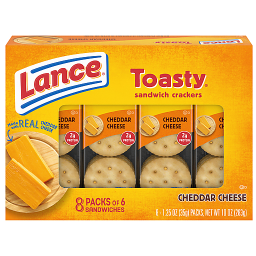 Get ready for a new favorite from Lance — Toasty Cheddar sandwich crackers! We combined your favorite toasty, round crackers with real cheddar cheese filling smack-dab in the middle. At Lance, sandwiches mean more: they aren’t just two somethings with whatever in the middle. Toasty Cheddar sandwich crackers are fresh-baked crackers on the outside paired with creamy cheese filling on the inside for a super-tasty snack. Or, as we say, a Lance Sandwich cracker is two awesomes on the outside with totally incredible in the middle. You get 8 cracker snack packs with 6 sandwich crackers per pack. That means you can enjoy a perfect snack for breaks, afternoon snacks, or whenever you’re hungry between meals. They’re also ideal for packing when you’re on-the-go snacking. You can grab all that delicious, cheesy goodness, any time. Lance has been fueling families for more than 100 years. Toasty Cheddar sandwich crackers are sure to become a new classic. Lance Sandwich crackers, the king of all sandwich crackers. Bring it!