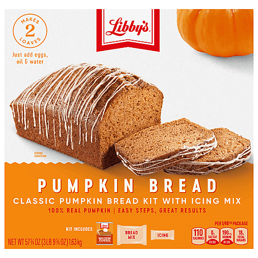 Libby's Pumpkin Bread Mix Kit lets you enjoy delicious pumpkin desserts with quick and easy steps and great results. This kit includes pumpkin bread mix, delightful icing, and one 15oz can of Libby's 100% Pure Pumpkin for that delicious and authentic taste of pumpkin. Use this 56.1 ounce kit to make two loaves of classic pumpkin bread by simply adding eggs, oil and water. This pumpkin bread making kit is also a great option when you want to whip up bundts or pumpkin muffins for a special sweet treat. Simply follow the baking instructions on the back of the box.