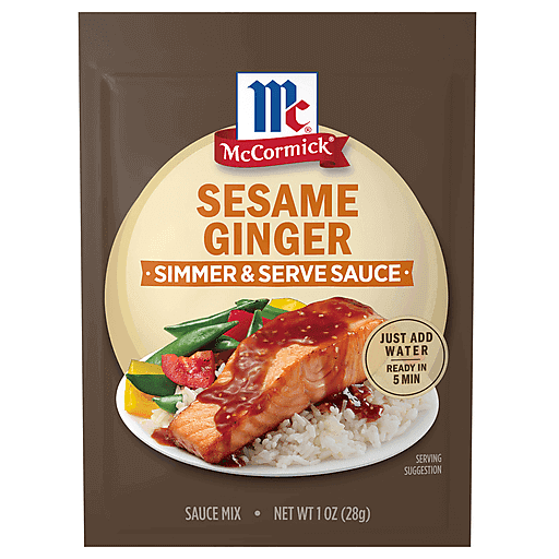 Introduce new flavors to weeknight meals with 5-minute McCormick® Sesame Ginger Sauce Mix. This sauce has distinctive taste from garlic, ginger, sesame seed and sesame oil that's just perfect for serving over chicken, steak, pork or salmon. McCormick Simmer & Serve Sauce Mixes deliver dinnertime inspiration for satisfying family meals that fit your busy schedule. They're convenient to keep in the pantry and easy to prepare. Just bring water and sauce mix to a boil and simmer for 1 minute then drizzle a delectable sesame ginger sauce over poultry, meat or seafood. Make Orange Chicken by adding a dash of orange juice and green onions while simmering the sauce then pour over chicken breasts. Sauce is also great for stir-fried veggies or fried rice.