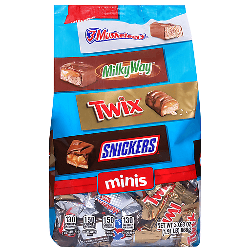 Enjoy this assortment of mini classic milk chocolate bars with BIG taste! SNICKERS, TWIX, MILKY WAY & 3 MUSKETEERS Minis Variety Bag is perfect for all occasions. Ideal for party favors, movie nights, candy bowls, and piñatas, individually wrapped mini candy bars ensure lasting freshness for all of life's sweet moments. Pack them in lunches for a sweet surprise or take this sharing size bag on the road for your next outdoor adventure. Don't stop at just unwrapping and enjoying these candies, add them to your favorite dessert and baking recipes.