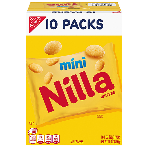 With NILLA Wafers Mini Wafer Cookies, the dessert possibilities are endless. These mini cookies are sweet, crispy, and artificially flavored vanilla wafers like their regular-sized counterparts, but their smaller size makes them convenient for grabbing and snacking. Mini NILLA Wafers are great for topping banana pudding, cakes, and cupcakes or creating mini ice cream sandwiches or vanilla pudding cups. These vanilla-flavored cookies are deliciously sweet snacks. Offered in individual snack packs ideal for school lunch snacks and office snacks, they are wonderful for enjoying on the go or in the comfort of your own home. Whether you're in the mood for something sweet to pair with your afternoon tea or coffee or preparing a homemade dessert for a family get together, NILLA Wafers are always a delicious option. Each box contains 10 conveniently portable 1-ounce single-serve snack packs of NILLA Wafers Mini Cookies.