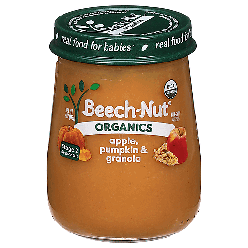 Beech-Nut Organic Baby Food is made with USDA Certified Organic and Non-GMO ingredients. Our apple, pumpkin & granola organic baby food puree has no artificial preservatives, colors or flavors and no added sweeteners--just what you'd expect for baby's first foods. Our fruits and veggies are gently cooked to preserve color, flavor, and nutrients to create a puree that's perfect for introducing solids. Free of the following allergens: dairy, peanut, soy, egg. This stage 2 baby food jar is ideal for babies 6 months and up.