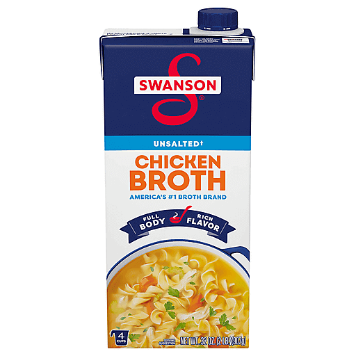 Swanson® Unsalted* Chicken Broth is the foundation of full bodied, rich flavor that turns good homemade meals into unforgettable ones. Whether you're simmering a hearty stew, creating a flavorful sauce, or cooking up savory one-pot dishes, Swanson® Chicken Broth is your go-to for elevating everyday meals. Swanson® Unsalted* Chicken Broth is made without added MSG, gluten free and made with non-GMO ingredients. The unsalted* profile gives you control over your seasoning, letting you enhance your dishes just the way you like them. It's an easy way to bring a rich homemade taste to all your culinary creations. With its deeply satisfying flavor, Swanson® Unsalted* Chicken Broth is as versatile as it is delicious. Use it to enhance soups, stews, and casseroles, or replace water in recipes to infuse rice, grains, and pasta with bold, savory taste. It's also perfect for sautéing vegetables or crafting luscious gravies and marinades. No matter how you use it, Swanson® Unsalted* Chicken Broth helps you bring more flavor and depth to every dish, making homemade cooking easier and more rewarding. (*Not a sodium free food)