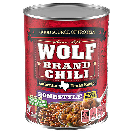 When you're craving a chili that tastes like home, purchase WOLF BRAND Homestyle Chili With Beans. The original, authentic Texas recipe dates back to 1895. Today, this canned chili features ground beef, pork and pinto beans simmered with diced tomatoes, green peppers, onions and a special blend of spices for a hearty chili with bold flavor. This Texas homestyle twist on a classic chili tastes delicious as a topping for corn chip pie or baked potatoes. You can also serve it alone with a side of corn bread and sour cream. Made with no preservatives and all-natural* beef and pork, WOLF BRAND canned chili is an excellent source of iron per serving. Plus, it quickly heats up on the stovetop or in the microwave for a weeknight meal that's ready in minutes. WOLF BRAND Homestyle Chili With Beans is your go-to choice for a bolder, thicker, heartier chili.