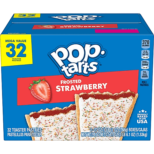 Pop-Tarts toaster pastries are the perfect sweet treat at breakfast, for a lunch snack, or dessert. Featuring a sweet Frosted Strawberry filling and crunchy sprinkles in a soft pastry crust, this ready to eat treat is perfect for kids snacks and adult snacks on the go. Pack Pop-Tarts Frosted Strawberry in kids lunchboxes for school snacks, or stock the office pantry with this individually wrapped grab and go adult snack. Pop them in the toaster and pair with milk, create your own ice cream sandwiches, or incorporate into your favorite dessert recipe for a sweet treat. These irresistible snacks for adults and kids provide a good source of three B vitamins. Stock your pantry with these shelf stable snacks and enjoy ready to eat treats anytime. A flavor for everyone, including beloved classics like Frosted Blueberry or Frosted Cherry, or our more indulgent flavors, Frosted Cookies and Creme or Frosted Chocolate Fudge.