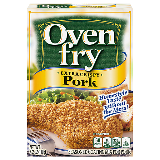 Kraft Oven Fry Extra Crispy Seasoned Coating Mix for Pork delivers homestyle flavor in a convenient pork coating mix that simplifies dinner. This extra crispy pork coating mix uses a savory blend of spices for a classic flavor without the mess. It's as simple as moistening boneless pork chops with egg or water, coating them with the mix, and baking until fully cooked. This 4.2 ounce box of oven baked pork seasoning makes perfectly delicious, crispy pork chops every time for a family dinner everyone will love. Take out the fuss of frying with Oven Fry seasoned coating mixes to take your chicken or pork dishes from good to incredible.