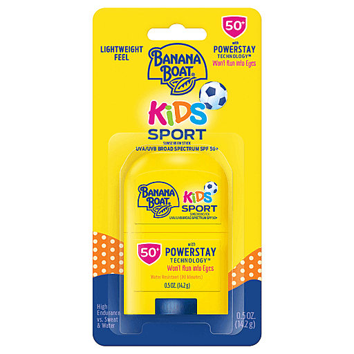 When your kids are active outdoors, they need powerful sun protection that’s mild and gentle enough for their sensitive skin. Available in the convenience of a stick, Banana Boat Kids Sport Sunscreen with PowerStay Technology has a mild formula that won’t irritate skin and strong sun protection that stays on so you can play on. It's the clinically proven UVA/UVB protection that families trust, with a lightweight, quick-absorbing formula that won’t run into eyes. Free from oxybenzone and octinoxate, this Banana Boat sunscreen stick is water resistant up to 80 minutes.