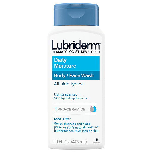 Cleanse and hydrate your skin from head to toe with Lubriderm Daily Moisture Body + Face Wash. This 2-in-1 full body wash and moisturizing face cleanser from a dermatologist-developed brand gently lifts away dirt, excess oil, and impurities to leave skin feeling clean and soft and healthier-looking. Suitable for all skin types, including sensitive skin, the lightly scented daily cleanser features a gentle formula with pro-ceramide and shea butter to preserve skin's natural moisture barrier. The hypoallergenic, dermatologist-tested body wash is free of sulfates, parabens, phthalates, and dyes, and has never been tested on animals. To use the hydrating face and body wash as part of your daily skincare routine, squeeze onto a washcloth, work into a rich, creamy lather, and then rinse. Follow with your favorite Lubriderm Daily Moisture Lotion to moisturize skin for 24 hours.
