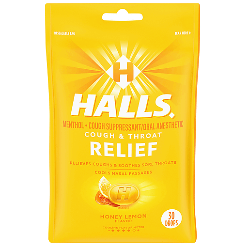 HALLS Relief Honey Lemon Cough Drops are ready for whatever life throws, or coughs, your way. With 7.5 mg of menthol per drop, these throat lozenges relieve coughs, soothe sore throats and cool nasal passages to relieve your worst symptoms. This effective cough suppressant comes in a refreshing yet soothing honey lemon flavor. Whether you're using HALLS cough drops for sore throat relief, cough relief or as an oral anesthetic, simply dissolve one drop in your mouth slowly, and repeat every two hours as needed. HALLS Relief cough drops are formulated for adults and children five years and older. This bag holds 30 individually wrapped drops and is resealable, making it ideal for stowing in your travel pack, purse or desk drawer. These packs are also perfect inclusions in a healthy gift or care package.