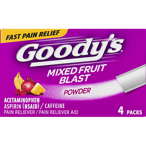 Goody’s mixed fruit blast headache relief powder provides fruit flavored pain relief fast. Get relief from minor aches and pains due to headaches, tension headaches, minor arthritis pain, colds, backaches, muscle aches, tooth pain, and menstrual cramps. Each powder packet includes 325 mg acetaminophen, 500 mg aspirin (nsaid) and 65 mg caffeine for rapid pain relief. Treat pain two ways: pour the easy to swallow goody’s powder directly on your tongue followed by a non-alcoholic beverage or mix into a non-alcoholic drink of choice. Great tasting mixed fruit blast over-the-counter medication powder comes in convenient, on-the-go stick packs for fast pain relief wherever you are, whenever you need it. Toss in travel medicine kits for strong, non-prescription pain relief. Contains goody’s mixed fruit blast headache relief powder; stick powders are for adults and children 12 years and older. Goody’s headache relief powder is fsa-eligible and hsa-eligible in the us. For fast pain relief, get to good.