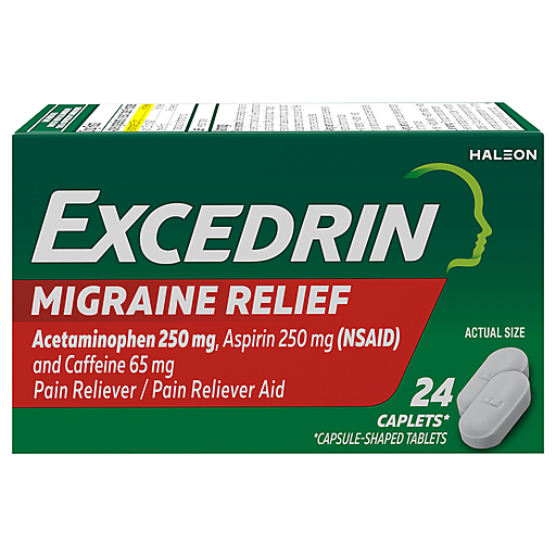 Excedrin Migraine Relief Caplets work fast for migraine pain relief, making Excedrin Migraine the #1 neurologist recommended OTC treatment for migraines (1). Available in convenient caplet form, this powerful migraine medicine delivers a specialized triple action formula containing two pain fighters and an amplifier. These Excedrin caplets combine aspirin and acetaminophen with caffeine to provide migraine relief, including migraine headache pain, sensitivity to light and sound, and nausea. For some, this migraine headache relief medicine starts relieving migraine pain in 30 minutes. (1) Among OTC medicine for migraines IQVIA, Inc., 2018