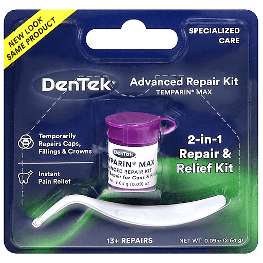 DenTek Temparin Max Advanced Repair Kit 13+ repairs, 0.09 oz. Temparin Max is made of the same ingredients dentists use to repair teeth or to replace a lost filling, cap, crown or inlay. Damage to fillings, caps, crowns or inlays need a quick fix to prevent oral pain. Temparin Max is a temporary remedy for up to 48 hours of protection before a dental visit. Apply Temparin Max with the no-mess applicator tool accurately to the affected tooth. This is an excellent addition to any oral health kit or dental first aid kit. Dental emergency product Temparin Max includes comprehensive, easy-to-follow instructions on how to replace a lost filling and how to secure loose crowns, caps or inlays. Only a dental professional can remove Temparin Max when it’s time to replace the lost filling or the loosened crown, cap or inlay. Please read all directions and cautions before applying Temparin Max. Go beyond brushing with DenTek! Help preserve and protect your teeth for a lifetime with DenTek's innovative dental care products.