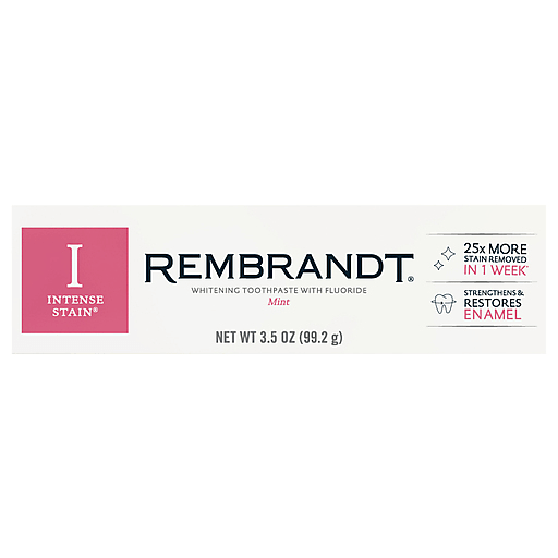 Keep enjoying your favorite foods and drinks while you polish away stains with REMBRANDT Intense Stain Whitening Toothpaste with Fluoride. This advanced daily-use teeth whitening toothpaste is expertly formulated to remove tough stains and restore and strengthen tooth enamel. It has micro-polishers that gently scrub away tough tooth stains, including coffee, red wine and tobacco, while its stain fighting properties prevent these stains from coming back. And, as an added bonus, our whitening toothpaste has fluoride to help restore and strengthen enamel. Make a whiter, brighter smile part of your daily routine with our Intense Stain whitening toothpaste. For visibly white teeth, choose REMBRANDT. Care for the smile you love.