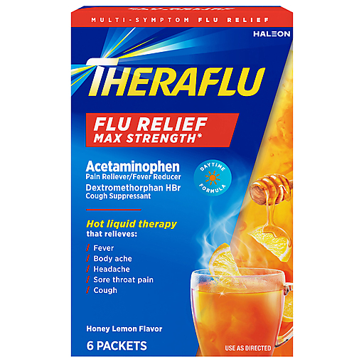 Theraflu Max Strength Flu Relief, Hot Liquid Powder Honey Lemon Flavor brings the heat to fight your worst flu symptoms with each power-packed dose. It helps provide relief from fever, body ache, headache, sore throat pain and cough. Dissolve a single packet of delicious honey lemon flavor powder into hot water to help relieve your worst flu symptoms.