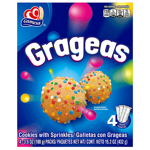 Gamesa Grageas are small, round vanilla cookies with colorful sprinkles on top are a great go to snack for kids. Small enough to carry anywhere and to enjoy snacking with the family. With 4 packs in each box, Grageas are great as an after school treat.