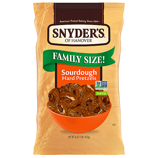 With Snyder's of Hanover Sourdough Hard Pretzels,you can enjoy the great taste of aged sourdough in a crunchy, traditional pretzel shape. Everyone can enjoy this Non-GMO Project Verified snack, which is made in a facility that does not process peanuts. That makes them ideal for school, lunches, sports and on the go. Or pair this fat-free snack with hummus, cheese spreads, dips, or enjoy them right out of the bag. Snyder's of Hanover has been America's Pretzel Bakery since 1909 and our pretzels give you that delicious crunch for the perfect snack! Snyder's of Hanover pretzels are kneaded and oven-baked to seal in all the flavor. Snyder's of Hanover pretzels have been shared across tables, across generations and across the country, making us America's favorite pretzel brand. This 16-ounce Family Size Bag of Snyder's Sourdough Pretzels has plenty for sharing with friends and family. Feed all your cravings with Snyder’s pretzel snacks.