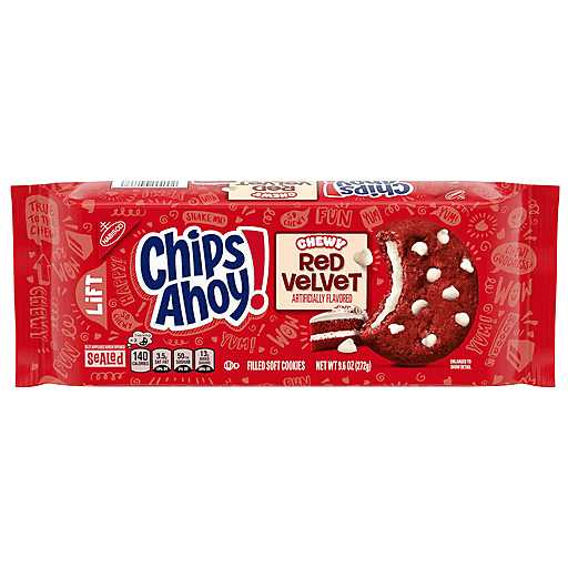 CHIPS AHOY! Chewy Red Velvet Cookies are Red Velvet flavored filled soft cookies with cream cheese flavored chips. These soft cookies are baked to perfection for maximum chewy goodness. Enjoy the indulgent taste of these red velvet cookies that are sure to become a household favorite treat. Make lunches at school or work more exciting by including CHIPS AHOY! Red Velvet cookies or serve these chewy cookies as birthday cookies at your next party. Regardless of the occasion, these cookies make a simply delicious treat, ice cream topper or dessert when a sweet craving strikes. The lift tab makes this package of soft baked cookies easy to open and close for convenient storage.