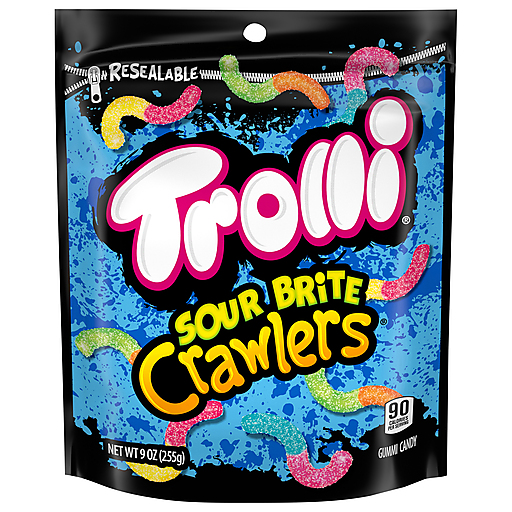 Trolli Sour Brite Crawlers are chewy gummy worms covered in a tongue-twisting sugary goodness, striking the perfect balance of sweet and sour in every bite. The flavors include cherry-lemon, strawberry-grape and orange-lime. Whether you're looking for a snack to satisfy your sweet tooth, or you're in the mood for something sour and tangy, Trolli Sour Brite Crawlers have got you covered. With their bold flavors, soft texture, and colorful design, they are sure to be a hit with anyone who loves gummy candies. So why wait? Treat yourself today and enjoy the mouthwatering flavors in every bite: Trolli Sour Brite Crawlers.