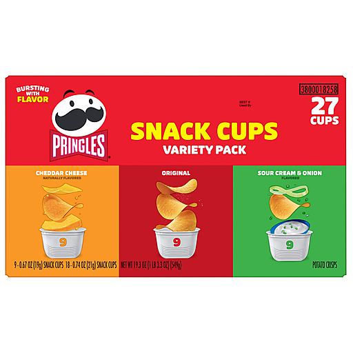 Enjoy the crisp, crunchy, hit-the-spot taste of potato and your choice of three delicious flavors. This variety pack includes single-serve cups of Original, Cheddar Cheese, and Sour Cream and Onion flavors. Insanely light, crispy and never greasy, they’re bursting with salty, savory flavor. These conveniently sized small cups make it easy to grab and go. Create snacking moments wherever and whenever; Grab a cup as a pick-me-up for after school or pack into school lunch boxes. Bring these portable snacks to game time and pack a few for other Pringles fans. Stash this anytime snack in your pantry or work desk to enjoy anytime. Share the variety pack at your next cookout or BBQ to turn up the flavor and fun among family and friends. Get your hands on Pringles potato crisps for enticing flavor options that keep you coming back, stack after stack.