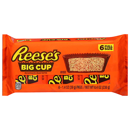 Name a more iconic duo. Everyone will wait... You can't beat this old fashioned, match made in heaven when it comes to creamy milk chocolate combined with delicious peanut butter. Get ready to taste perfection! REESE'S Big Cup milk chocolate peanut butter cups are ready to be your go-to snack. Bring this pack along to the next sporting event as a concession treat, as movie marathon snacks or game night prizes. Store them in your pantry for an anytime snack or slip a pack into lunch boxes and purses for a midday surprise. REESE'S Big Cup milk chocolate peanut butter cups are a sweet delight that you can bite, break, dunk or nibble on. Yes! Dunk them into a cold glass of milk, a cup of hot chocolate or your coffee to experience the melty goodness. Put a unique twist on classic baked goods like cookies, cupcakes and ice cream decadents with whole, halved or crumbled REESE'S cups. These peanut butter treats are kosher certified and gluten free candies that go well with almost everything, especially during your holiday celebrations. Add them to Christmas stockings, Halloween candy bowls, Valentine's Day gift bags and Easter baskets. Just don't forget to save a few for yourself!
