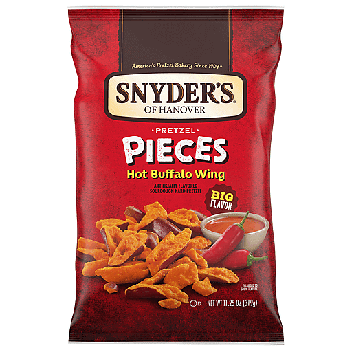 Snyder's of Hanover Hot Buffalo Wing Pretzel Pieces are bursting with big flavor! Enjoy crunchy sourdough pretzels generously seasoned with the spiciness of hot sauce, cayenne pepper, and paprika. You'll love the crunch, hearty satisfaction, and craveable bold flavor found in every bite of these Snyder's Pretzel Pieces. These crunchy pretzel pieces are a perfect snack for tailgates, parties, or movie night. Snyder's of Hanover has been America's Pretzel Bakery since 1909 and our pretzels give you that delicious crunch for the perfect snack! Made in a facility that does not process peanuts, Snyder's pretzels are made from wholesome ingredients, kneaded, and oven-baked to seal in all the flavor. Snyder's of Hanover pretzels have been shared across tables, across generations and across the country, making us America's favorite pretzel brand.